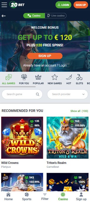 Na 20bet môžu hráči využiť bonus 100 % do 120 € a 120 FS za prvý vklad. Keďže ide o uvítací bonus, tak sa dá získať iba raz.