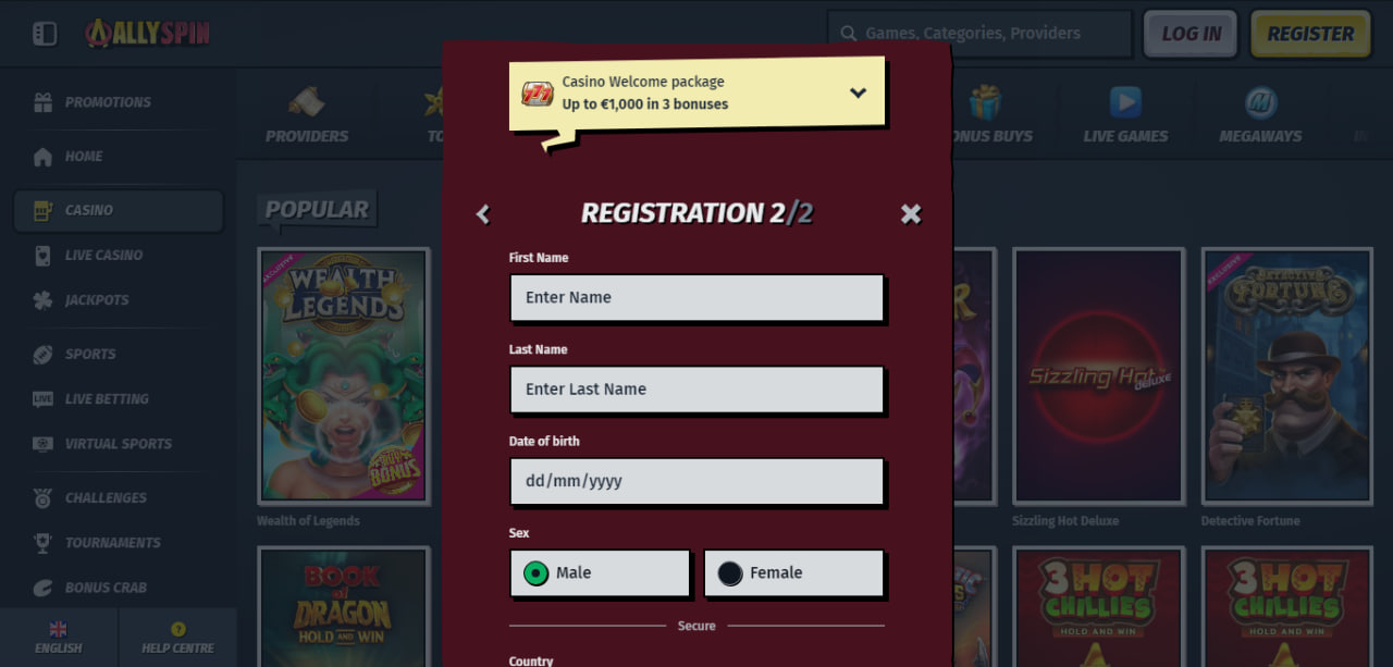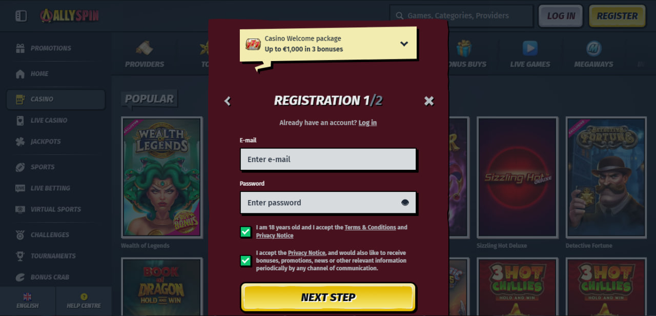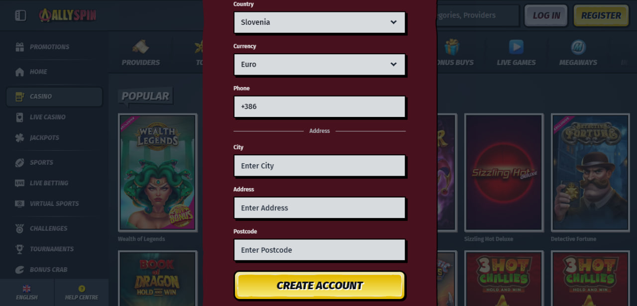 Registrácia je potrebná formalita, na AllySpin je však rýchla a bezproblémov a všeobecne vám nezaberie viac času, ako je nutné. Stránka nie je dostupná v slovenskom jazyku, preto pre istotu prikladáme podrobný postup, ako procesom prejsť.
