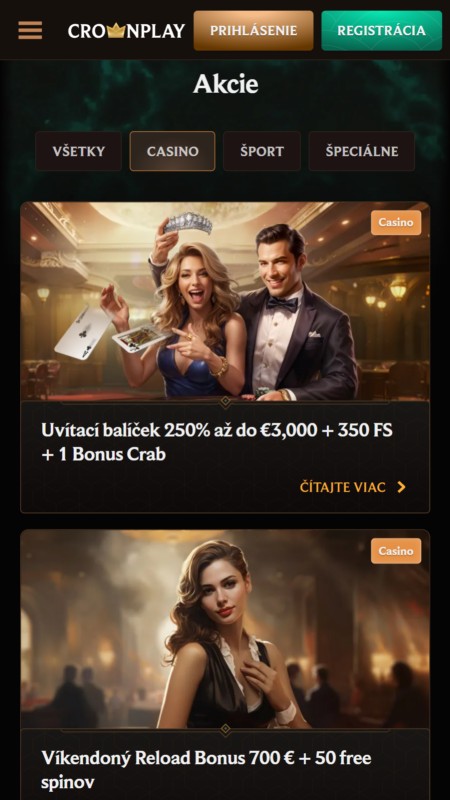 Ponuka bonusov sa v Crownplay točí rýchlo. Vždy sa oplatí pozrieť sekciu akcií priamo na webe, či nepribudlo niečo nové. Podmienky sú férové a proces aktivácie zvládne každý na pár klikov. Ak chcete z vkladu vytrieskať maximum, toto je správna cesta.