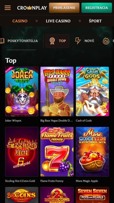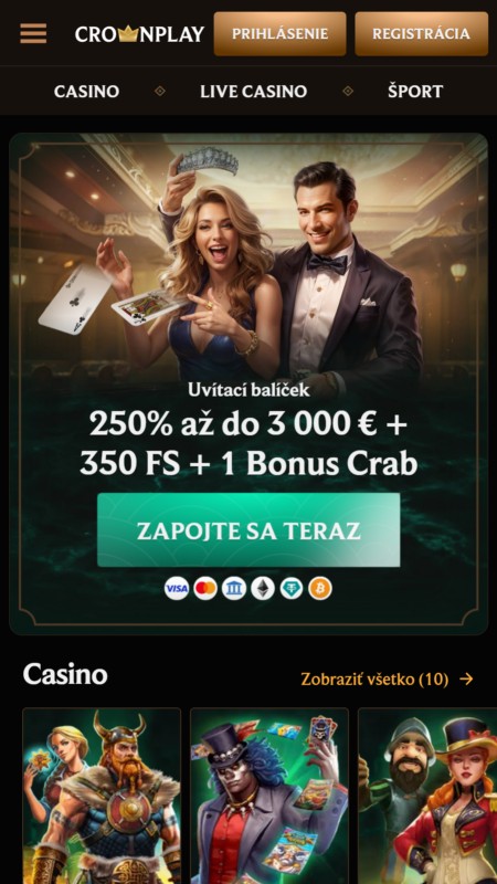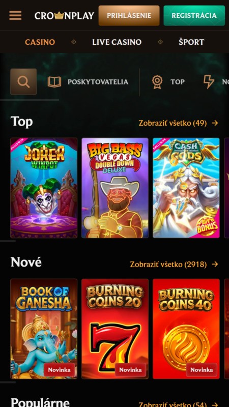 Web Crownplay vsádza na tmavý, luxusný vizuál so zlatými prvkami, ktorý pôsobí moderne a prehľadne. Orientácia je vďaka bočnému menu intuitívna, či už hľadáte sloty alebo športy. Registrácia je blesková a mobilná verzia reaguje svižne aj bez aplikácie. Všetko podstatné máte hneď na očiach, stránka sa zbytočne neseká a grafika hier vynikne na každom zariadení.