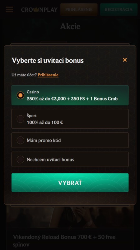 Crownplay má pre nových hráčov štedrý balík. Môžete získať 250 % k prvému vkladu až do 3 000 € a k tomu 350 free spinov. Ak vložíte aspoň 20 €, dostanete aj jeden pokus v hre Bonus Crab, kde sa dajú vytiahnuť ďalšie odmeny.