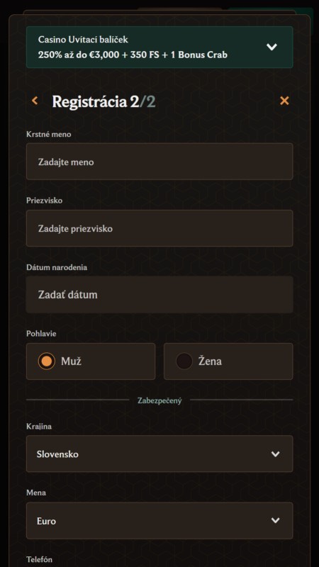 | 💰 Uvítací bonus | 250% až do 3,000 € + 350 free spinov + 1 bonus crab |