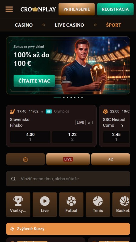 V Crownplay to nie je len o slotoch. Majú tu plnohodnotnú stávkovú kanceláriu, kde natipujete takmer čokoľvek. Okrem klasických predzápasových stávok ponúkajú aj live stávky priamo počas hry, často aj so živými prenosmi. Kurzy sú férové a výber športov obrovský.