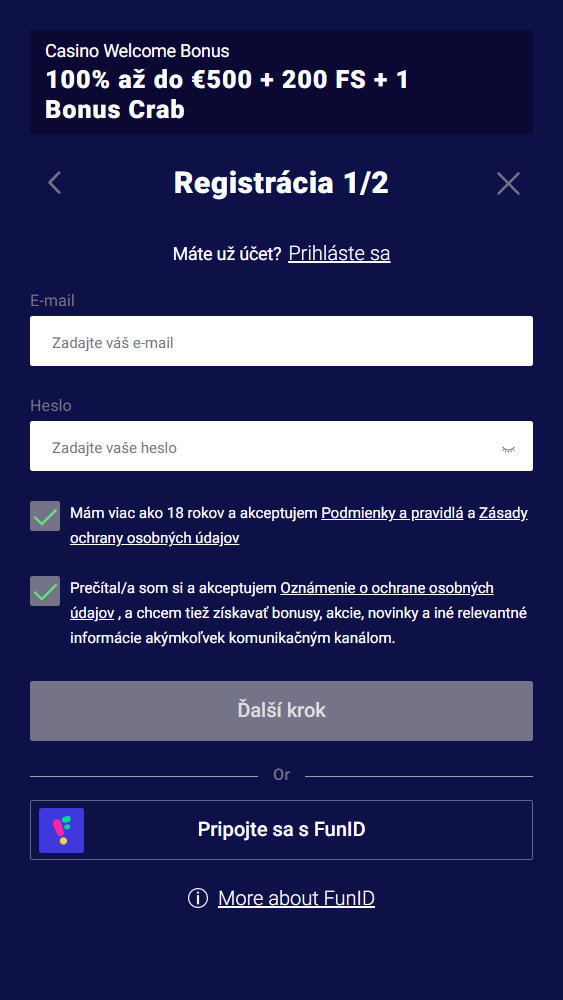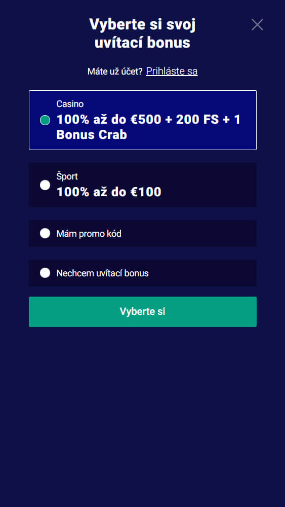 | 👋 Uvítací Bonus | 100% do 500 € a 200 FS + 1 Bonus Crab |