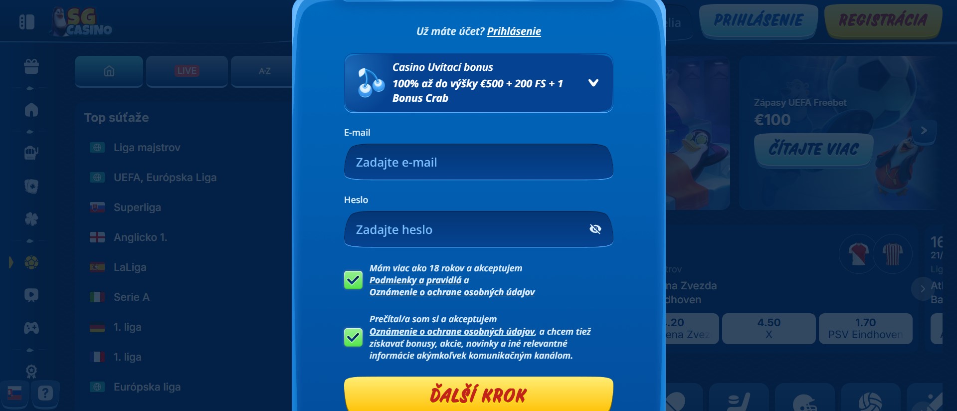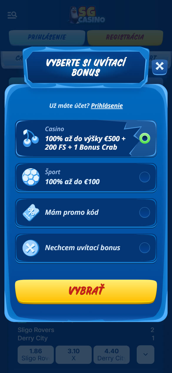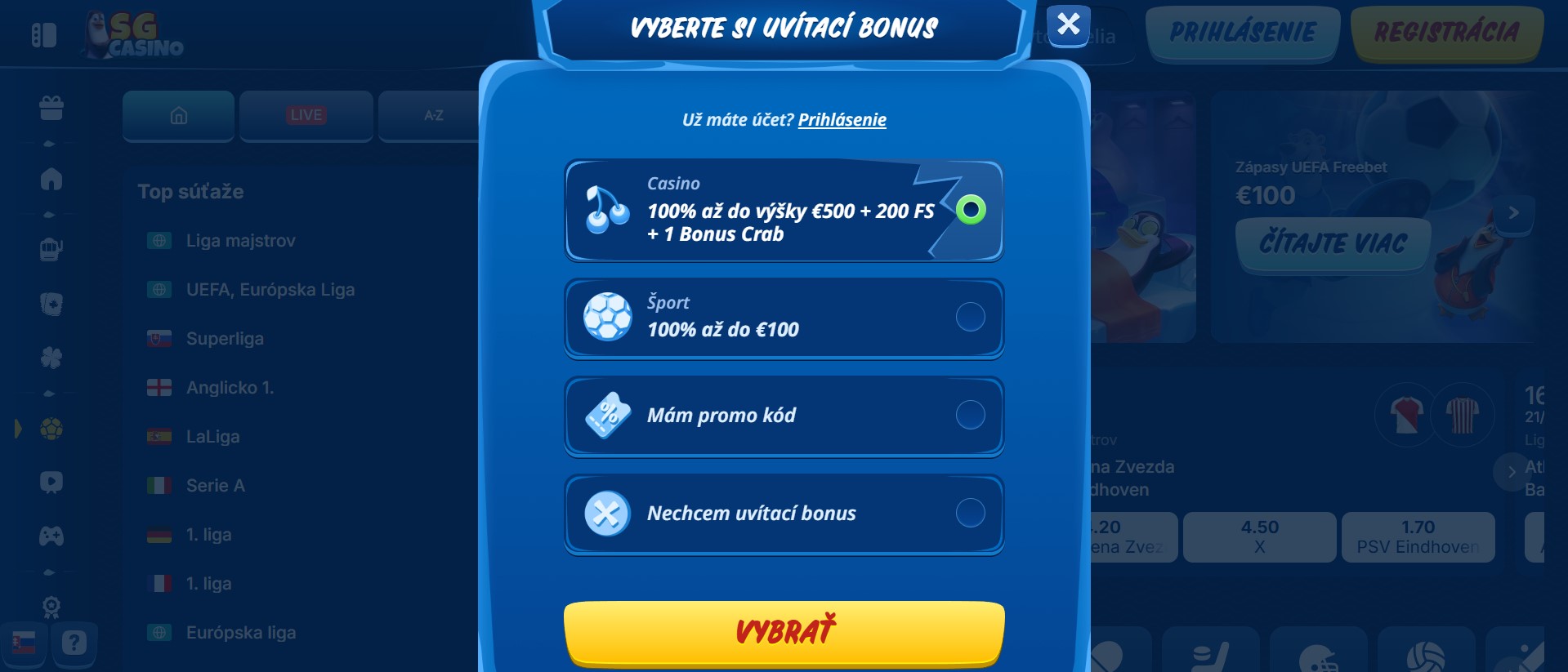 SG Casino ponúka atraktívny uvítací bonus pre nových hráčov. Po registrácii a prvom vklade môžete získať bonus vo výške 100 % až do 500 €, k tomu navyše 200 točení zdarma a špeciálny bonus „Bonus Crab“. Na získanie bonusu je potrebný minimálny vklad 20 € a 35 násobok počiatočnej sumy vkladu a prijatého bonusu. Na získanie free spinov je však potrebné počiatočnú sumu vkladu + bonus pretočiť 40 krát.