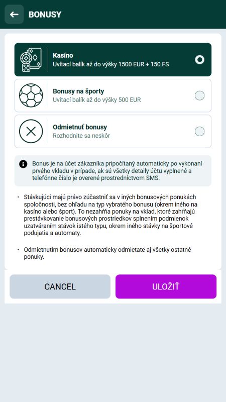 Hneď na začiatku si zvolíte svoju odmenu. Na výber máte balíček pre kasíno až do 1 500 € a 150 free spinov, alebo športový bonus na stávkovanie. Ak sa neviete rozhodnúť, môžete tento krok zatiaľ preskočiť.