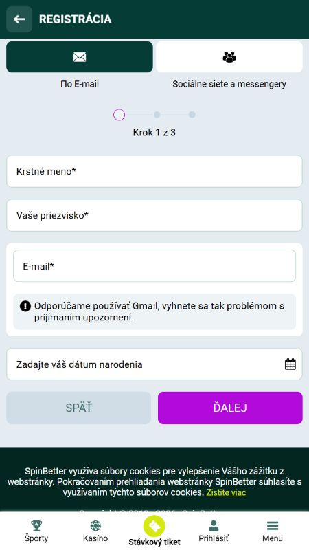 Registrácia v Spinbetter
