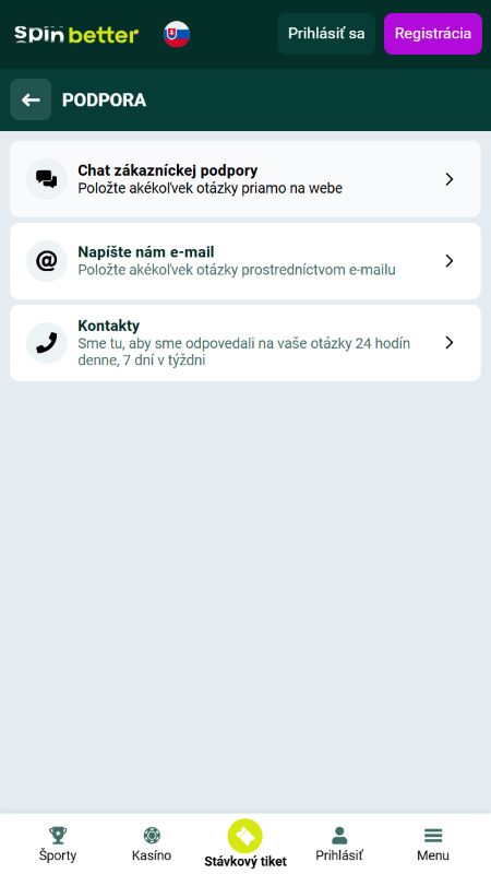 Ak narazíte na problém, podpora Spinbetter reaguje rýchlo. Live chat beží nonstop a veľkým plusom je, že sa dohovoríte v slovenčine.Okrem nej ovládajú operátori desiatky ďalších jazykov, vrátane angličtiny či nemčiny. Ak neriešite nič urgentné, môžete napísať aj e-mail. Odpovede sú k veci, žiadne zložité frázy, proste vám pomôžu a hotovo.