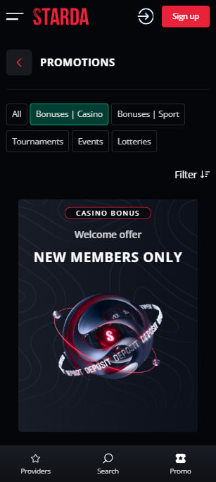 Kasíno Starda ponúka pri registrácií dva typy uvítacích bonusov v závislosti od toho, či je vaším koníčkom skôr športové stávkovanie alebo kasínové hry. V obidvoch prípadoch je však bonus pomerne uspokojivý. Pre kasínové hry ide o 100% bonus k prvému vkladu do výšky až 600€ a až 500 free spins zdarma, pre športové stávkovanie ide o bonus 150% k prvému vkladu do výšky 100€. Minimálny vklad pre získanie bonusu je v obidvoch prípadoch 10€.