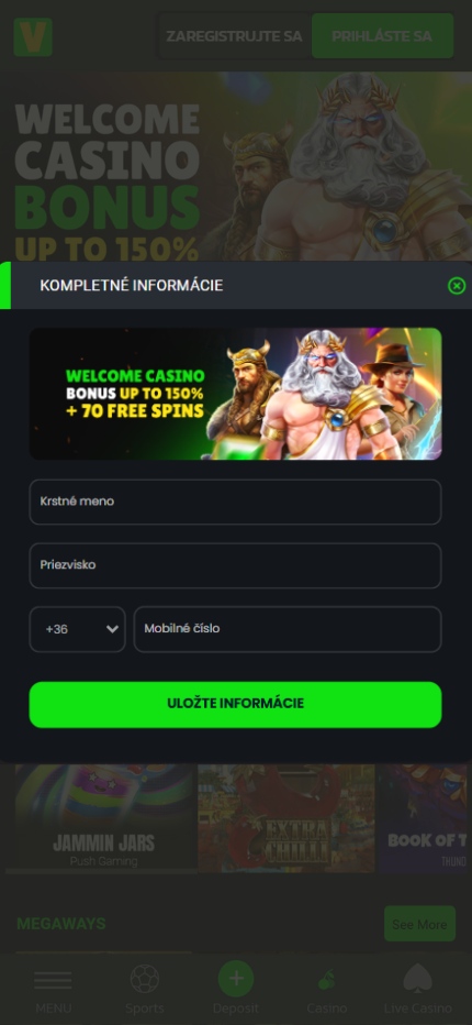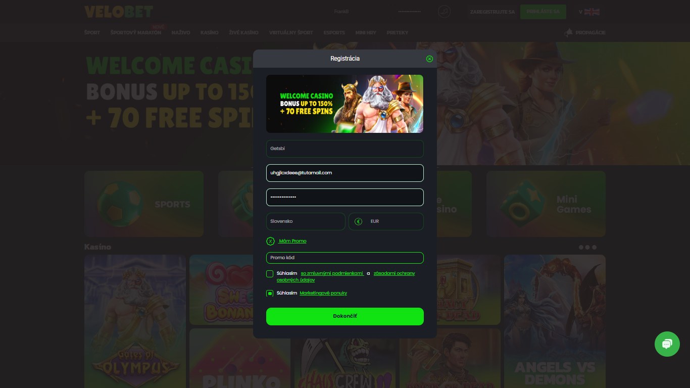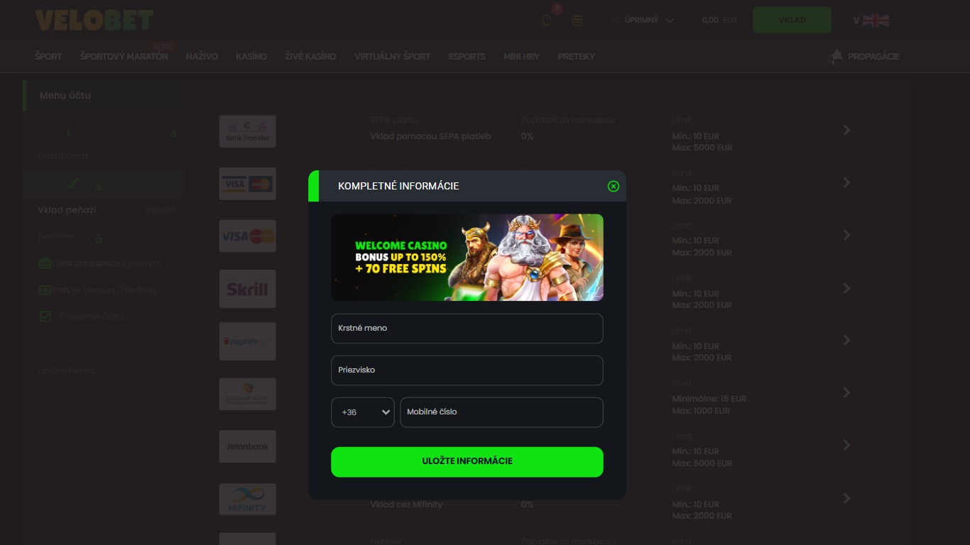 Registrácia v kasíne Velobet