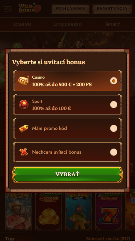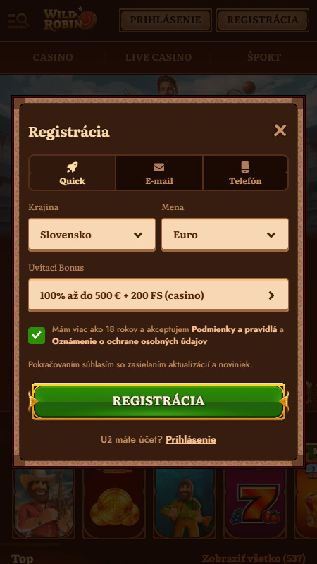 Registračný proces je na platforme WildRobin mimoriadne rýchly a zaberie vám len niekoľko okamihov. Po registrácii si hneď môžete pozrieť všetky hry v ponuke kasína a zhodnotiť, či vám ponuka vyhovuje. Až potom sa od vás vyžaduje zadanie emailovej adresy a ostatných údajov.