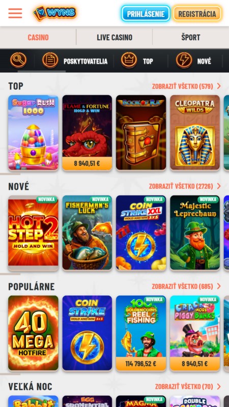 Pri hernej ponuke pôsobí Wyns silno už na prvý pohľad. Medzi najviditeľnejšie značky patria Pragmatic, Playtech, Spinomenal, Yggdrasil, Red Tiger, Novomatic, Playson, Hacksaw Gaming či Pragmatic Live. To je dôležité, pretože z pohľadu slovenského čitateľa nejde len o počet hier, ale aj o kvalitu a známosť dodávateľov. Wyns navyše priebežne dopĺňa novinky a zameriava sa na neustále rozširovanie knižnice o nové vydania od top providerov.