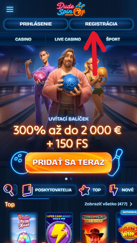 Web DudeSpin pôsobí moderne – tematika, tmavší background, veľké bannery a horizontálne menu s rýchlym prepínaním medzi kasínom a stávkovou kanceláriou. Navigácia je štandardná.