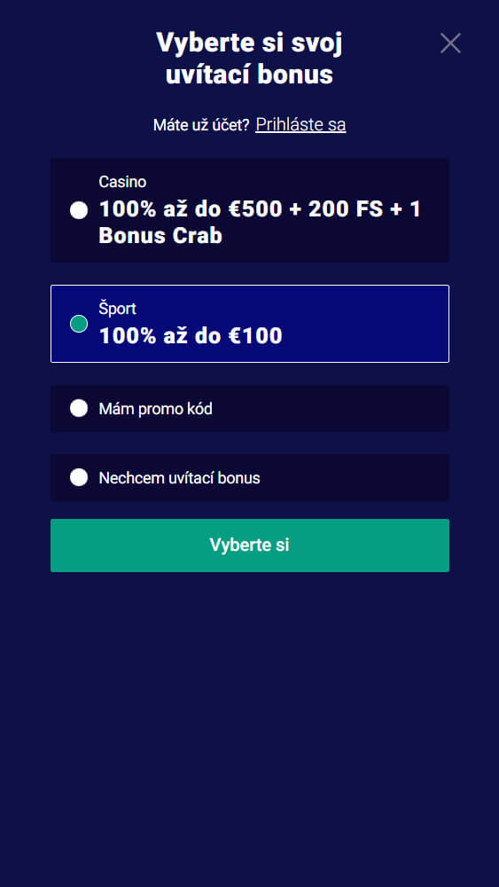 Na webe Frumzi vyberte možnosť “Registrácia”. Pomocou tohto tlačidla začnete registračný proces. Vyberte si potom uvítací bonus, ktorý použijete – buď v stávkovej kancelárii, alebo v kasínovej časti. Okrem toho je tu možnosť zadania promo kódu, takže ak nejaký máte, neváhajte ho zadať na tomto kroku.