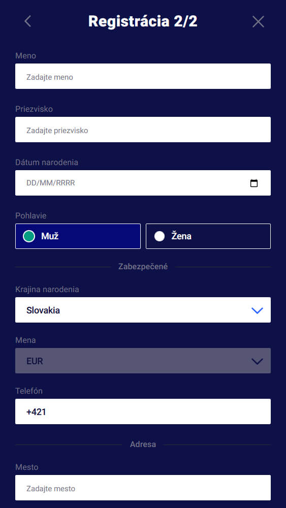 V kroku 2/2 sa vyplňujú skutočné údaje o novom používateľovi platformy. Sem patrí meno a priezvisko zakaznika, ako aj dátum jeho narodenia a pohlavie. Dodatočne je potrebné uviesť telefónne číslo a menu, v ktorej bude uskutočňovať transakcie.