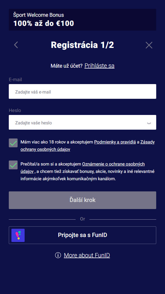 Následne vyplňte základné údaje pre budúce prihlasovanie do svojho účtu. Okrem e-mailovej adresy a hesla je potrebné prečítať si podmienky platformy a udeliť súhlas s tým, že ste plnoletou osobou. Alternatívne môžete využiť registráciu pomocou účtu FunID, kde sú zhromaždené údaje o Vás, čo umožní rýchlejšie dokončiť registráciu.