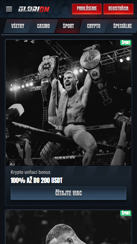 Glorion láka nových stávkarov na férovú ponuku, ktorá vám zdvojnásobí prvý vklad. Máte na výber dve verzie podľa toho, akú menu preferujete. Buď stavíte na klasiku a získate 100 % až do 100 €, alebo využijete krypto verziu 100 % až do 200 USDT.