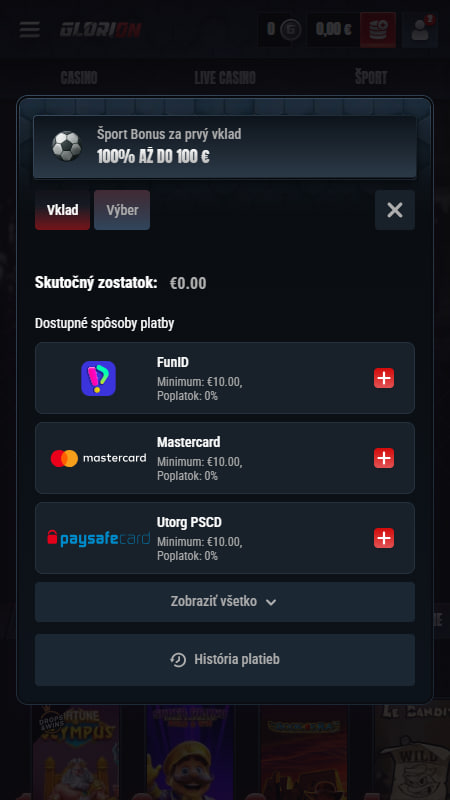 Glorion má nastavené limity tak, aby vás pri hre nebrzdili. Pri väčšine metód je spodná hranica pre vklad aj výber 10 €, čo je férový základ pre každého. Štandardne môžete naraz vytiahnuť až 5 000 €. Ak však hráte pravidelne a stúpate vo VIP úrovniach, limity vám ochotne navýšia. Pri najvyšších leveloch sa viete dostať až na hranicu 20 000 € na jeden výber.