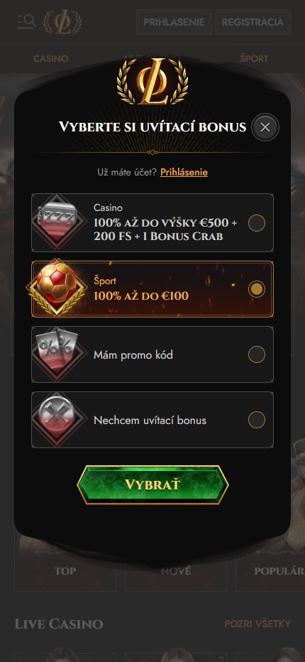Na hlavnej stránke kliknite na “REGISTRÁCIA” v pravom hornom rohu. Nezabudnite si v prvom kroku vybrať konkrétny bonus alebo zadať promo kód. Následne stlačte “Vybrať”.