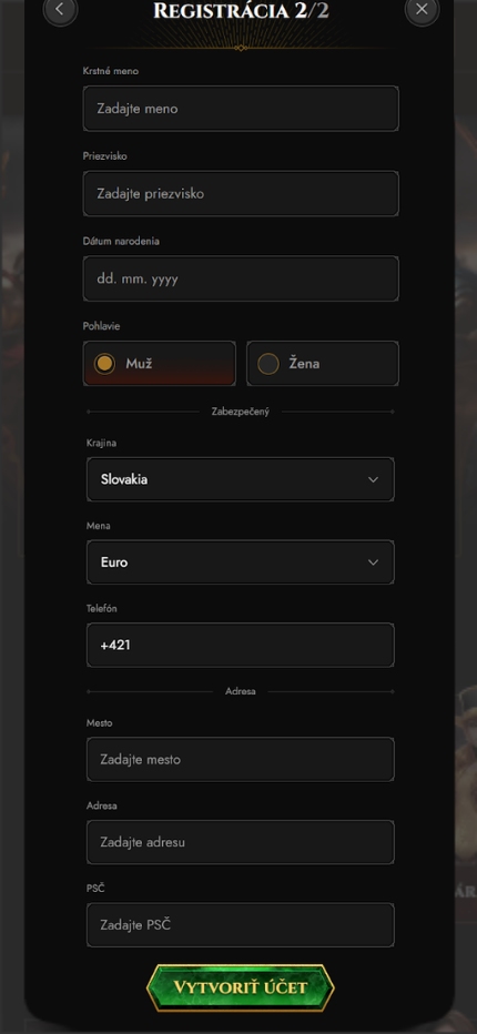 V ďalšom kroku vyplňte osobné údaje: meno a priezvisko, pohlavie, krajina, mena atď. Nezabudnite uviesť adresu vášho bydliska a telefónne číslo. Skontrolujte všetky údaje pred ich odoslaním.