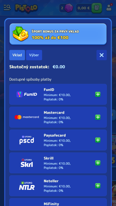 | 💳 Platobné metódy | Visa, Mastercard, Paysafecard, FunID, Neteller, Skrill, kryptomeny |