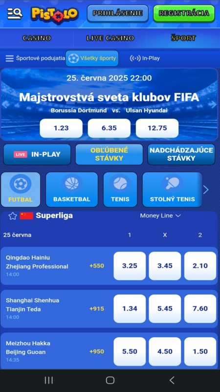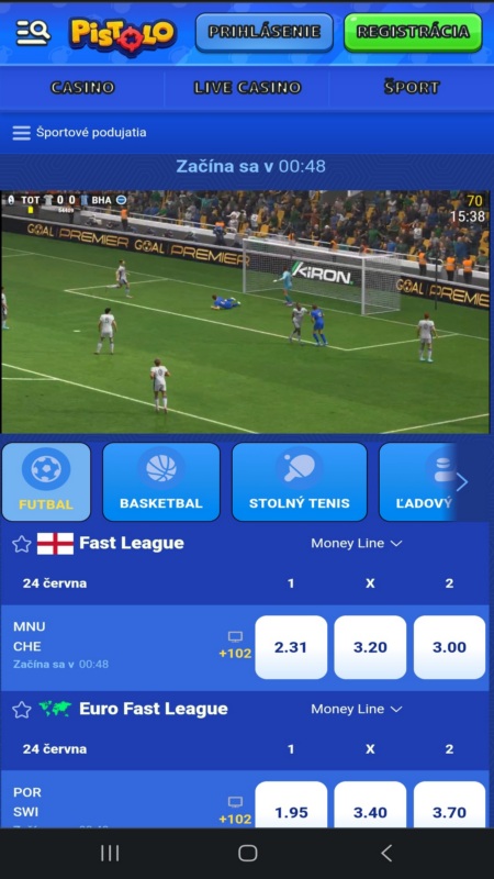 Pistolo ponúka živé stávky na najobľúbenejšie športové súťaže: futbal, hokej, tenis, stolný tenis, ľadový hokej, e-futbal, volejbal, e-basketbal, kriket, counter-strike, plážový volejbal. Ponuku nájdete vybraním položky “Stávky live” v ľavom menu.