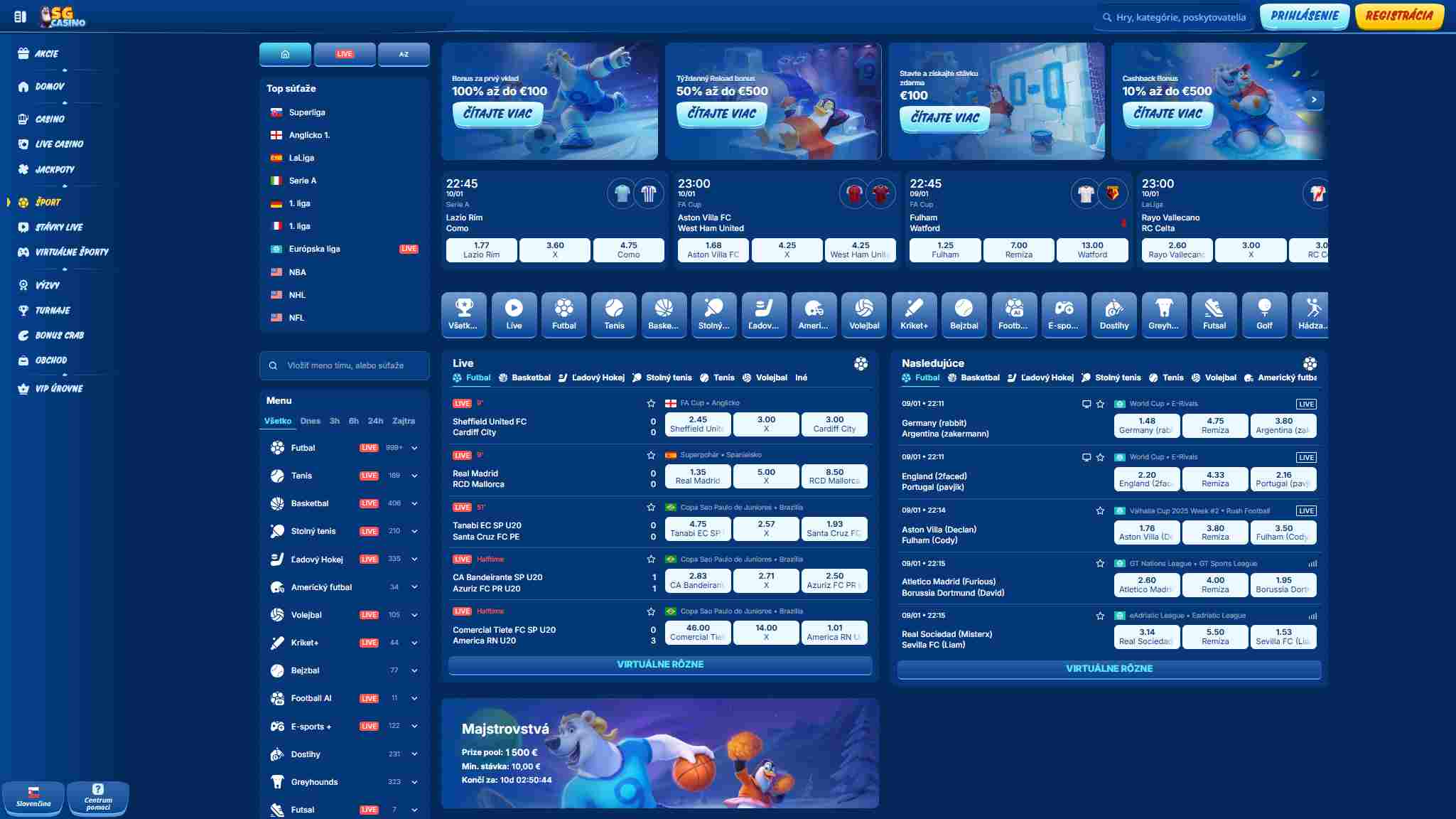 SGCasino je moderná platforma pre športové stávkovanie, ktorá si získava popularitu medzi hráčmi vďaka svojej širokej ponuke stávok, užívateľsky prívetivému rozhraniu a spoľahlivému fungovaniu. Táto recenzia vám pomôže objaviť všetky dôležité funkcie tohto bookmakera, vrátane jeho licencie, bezpečnosti a možností registrácie.