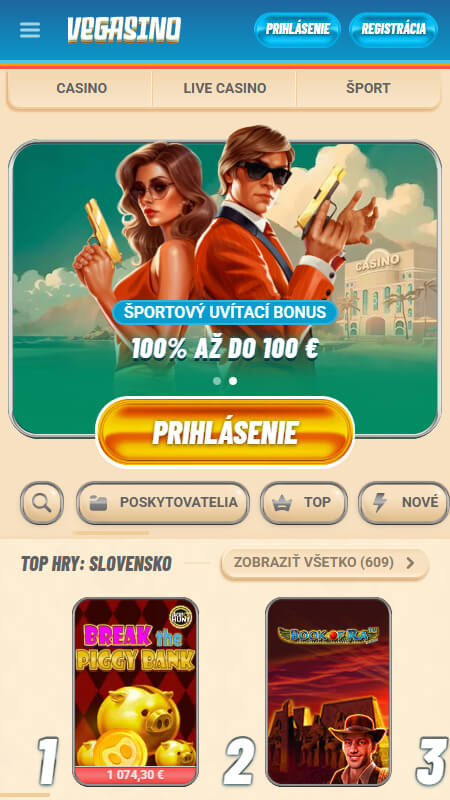 Vegasino má obrovskú kasíno sekciu s tisíckami hier. Nájdete tu klasické automaty, progresívne jackpoty aj moderné video sloty. Ak preferujete stoly, v ponuke je ruleta, blackjack a baccarat. Tieto hry si spustíte ako softvér alebo naživo so skutočným krupiérom. Nechýbajú ani rýchle crash games či stieracie žreby. Všetko je v bočnom menu prehľadne rozdelené, takže hru nájdete okamžite. Funguje to rýchlo a bez sekania.