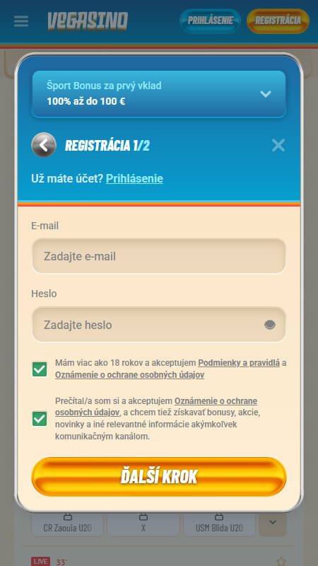 Vytvorenie účtu je vo Vegasino fakt rýchle. Celý proces je rozdelený na tri jednoduché časti, ktoré zvládne každý.