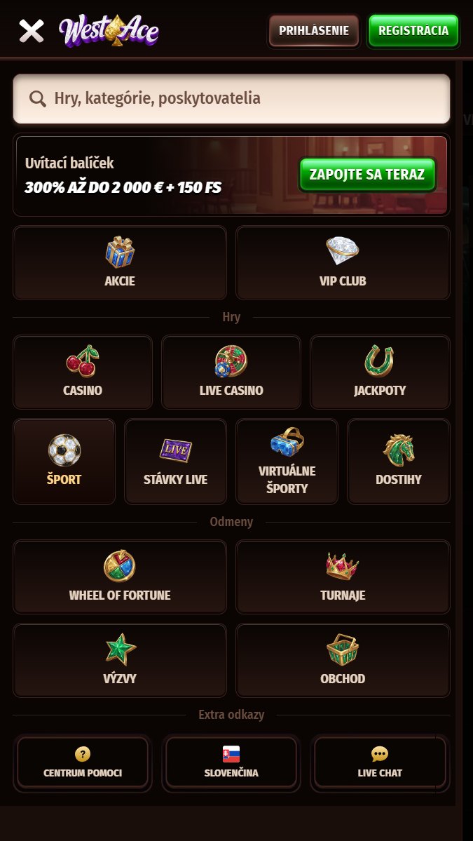 Rozhranie Westace pôsobí moderne a organizovane, ide o vizuálne výrazný, ale funkčný dizajn. Navigácia medzi športovou sekciou a pokladňou je intuitívna, filtrácia športových trhov je prehľadná a stránka je dobre optimalizovaná pre mobil aj desktop. Web je oficiálne dostupný vo viacerých jazykoch, taktiež aj v slovenčine.