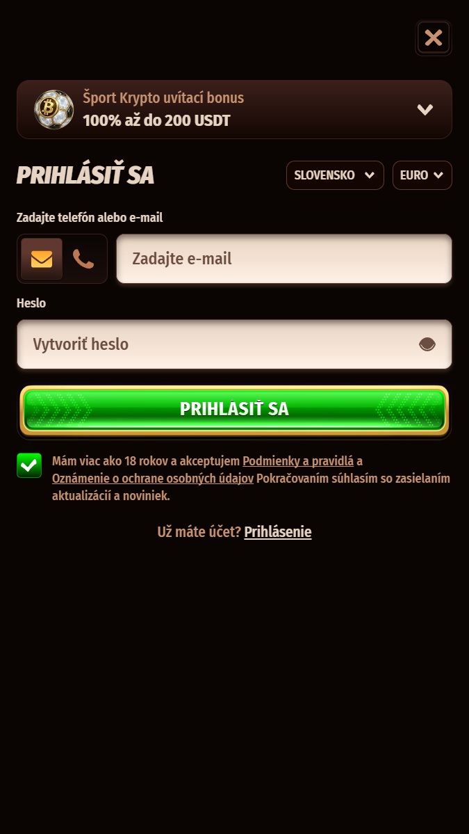 Športový uvítací bonus je nastavený pomerne transparentne: 100 % z prvého vkladu až do 100 €, s minimálnym vkladom 20 €, 200 USDT pri kryptomenách s minimálnym vkladom 20 USDT. Najprv musíte svoj prvý vklad raz pretočiť pri minimálnom kurze 1,50, až potom sa bonus pripíše. Následne treba pretočiť kombináciu vkladu a bonusu 6×, pri jednoduchých stávkach minimálne 2,00 a pri akumulovaných stávkach 1,50 na každý zápas.