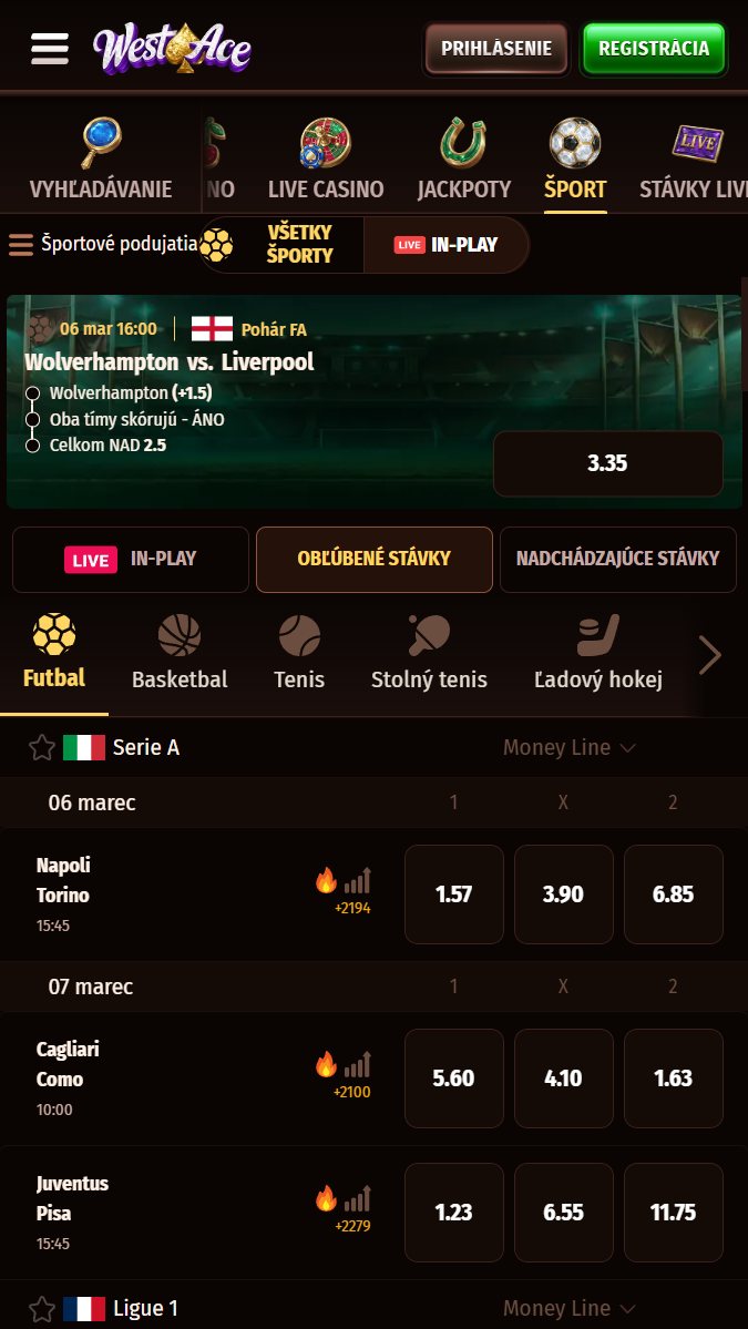 Live sekcia umožňuje stávkovať počas zápasu na desiatky trhov – od základného výsledku cez góly až po rôzne štatistiky. Westace podporuje cash out a pri vybraných zápasoch ponúka predčasné vyplatenie výhry, ak váš tím vedie o 2 góly (pri basketbale a tenise platia upravené limity – rozdiel v bodoch či setoch).