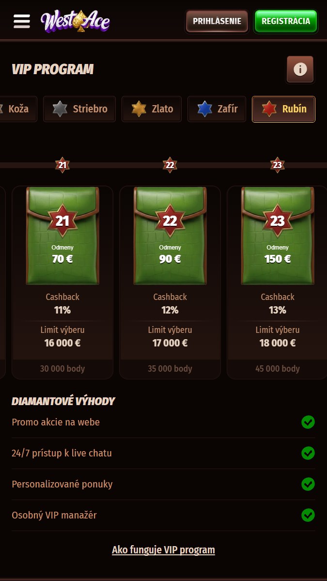 Westace buduje viacúrovňový VIP program: základná úroveň dáva prístup k štandardným promo akciám, vyššie úrovne prinášajú zvýšené limity výberov, personalizované bonusy, účasť v exkluzívnych turnajoch a na najvyšších úrovniach aj vlastného VIP manažéra a prémiové cashback percentá.